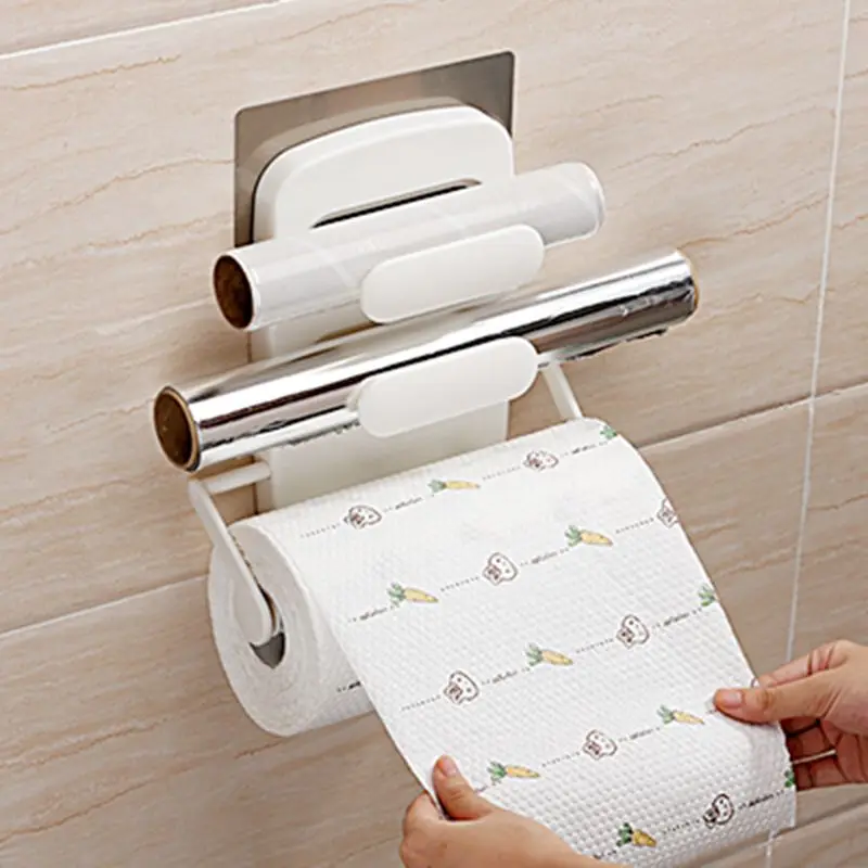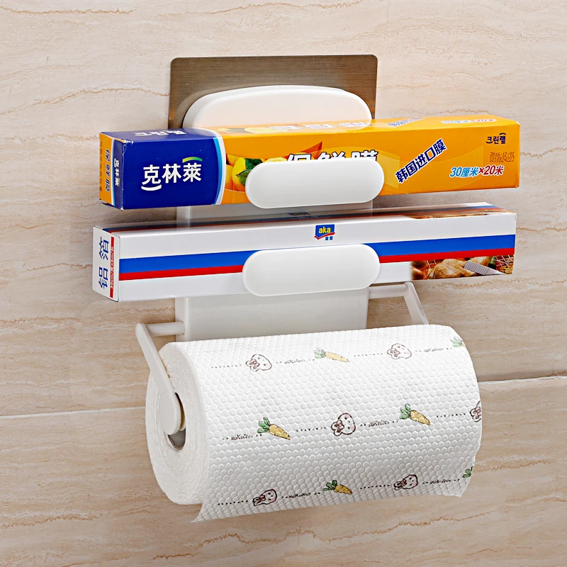 Quick Cling Film Cutter Plastic Food Wrap Dispenser Roll Paper Towel Storage Rack Kitchen Organizer